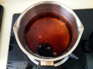 将红糖、冰糖放入水中,小火使之融化。