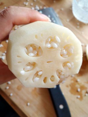 将莲藕孔洗净。将泡好的糯米,塞入莲藕孔中。