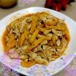 原锅中放入姜丝、将调好B的汁倒入锅中煮开,放入水淀粉、鸡肉、芒果条略拌匀,关火即可