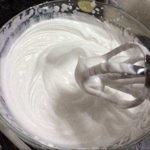 接下来取出淡奶油加入砂糖。打发五六分发 有纹路。提起来时低落的奶油会叠加 纹理不会马上消失 成流动状、