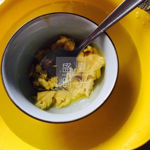 黄油软化 可以在烫在开水里面。化成水状加入消化饼干搅拌均匀、