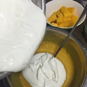 倒入纳凉后的芒果泥。开始用刮刀和稀泥……记的搅拌均匀蛤…