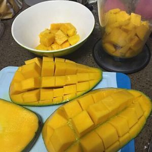 (芒果切成这样子。 这个图片是找的。 自己切的没真么好看)拿出冷冻后模具加入芒果块。 怎嚒好看这嚒摆倒入搅拌后的糊 震震气泡。放入冰箱冷冻四小时以上☝️