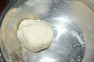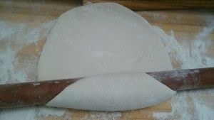 用擀面杖将面团擀成面片