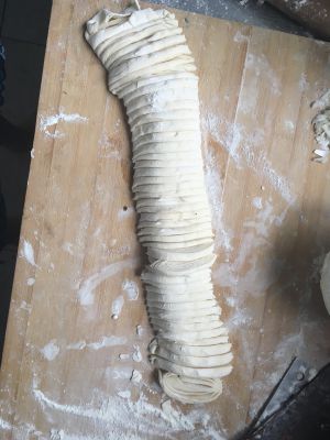 将擀好的面片卷成图上所示