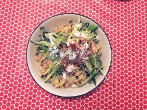水开放入面条,煮熟捞出过凉水,倒入少量味极鲜,醋,味精,和香油,搅拌均匀,把面摆盘,上面麻上黄瓜,葱花、辣椒面,锅内烧热油,油热浇上即可(家里刚盐的糖蒜,切丁放在面里了,如果没有也可不放)撒上少许芝麻,开吃
