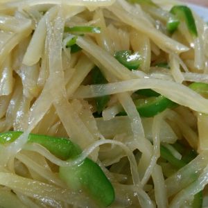 待油面冒出烟,将切好的青椒丝土豆丝一齐倒入油锅