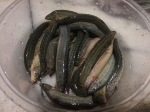 活泥鳅放入一点点盐,几分钟后就死翘翘了,而且不黏手。这个泥鳅有点大,回来用剪刀剪开肚子,洗干净。
