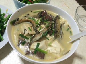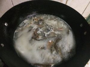 放入蒜,花椒,香叶,姜,家里也就这些东西了。煸炒一会,倒入莫过泥鳅的开水,要开水呦