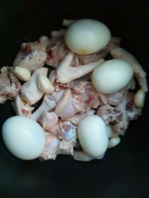 首先煮蛋,可以用电饭锅放张纸巾,加些水使纸巾刚好浸湿为宜!放入生蛋,按下煮饭键,等到跳至保温键再焖5_10分钟,即可取出剥蛋壳!也可用水煮,不过比较耗水和电!接着把鸡肉洗净放入电压锅!