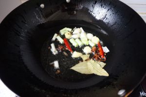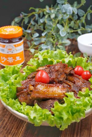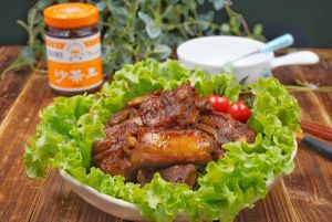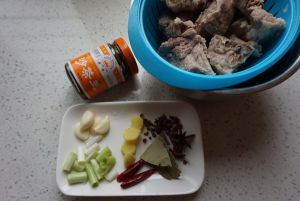 排骨控水,葱姜蒜、辣椒,香叶,花椒,八角,沙茶酱备好。