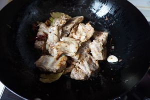 排骨斩成小块儿,凉水下锅水开以后撇去血沫,捞出控水。