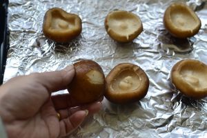 将顶部突起部分切掉(这样方便排放,切下来的香菇小丁直接放入香菇盅内)