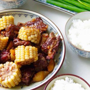 30分钟后,放土豆和玉米,炖10分钟,待玉米和土豆都熟了后,略翻炒下,放蒜片,出锅。