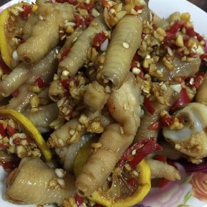 最后,把辣椒大蒜柠檬倒进鸡爪里,陈醋白醋没过鸡爪 酱油盐适量(个人口味)喜欢芥末的也可以加哦 泡一晚味道更加