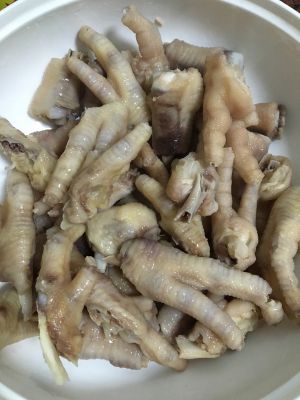 这是我已经处理好的鸡爪啦 鸡爪洗净去指甲,先焯水,然后锅里放冷水 生姜 料酒 放鸡爪煮10分钟,把鸡爪捞起放事先准备好的冰水泡20分钟(我泡了还放冰箱急冻10分钟)现在就可以准备配料啦