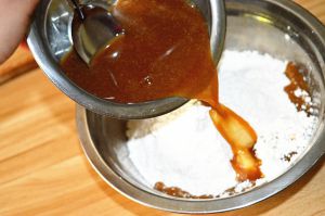 将融化好的红糖水倒入面粉中;
