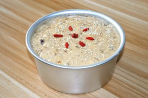 大约30分钟左右,面糊发酵至原来的2倍左右,然后放入枸杞,撒上白芝麻;