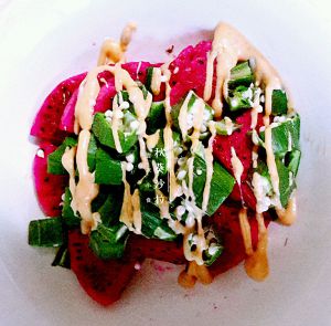 ③将晾凉的秋葵切好,和火龙果混合。
