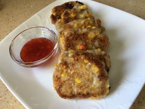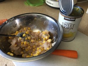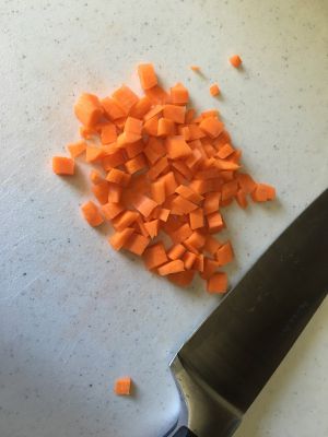 把紅蘿蔔切小粒,和鯪魚肉,玉米一起攪拌均勻。