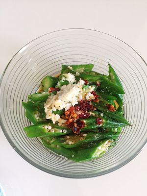 油蒜辣椒入锅加热再倒入秋葵中拌匀即可,似不似很简单。