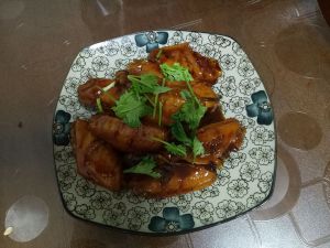 收汁,装盘,散上香菜,一道美味的可乐鸡翅,就做好了