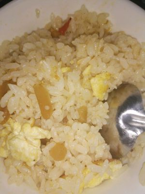 鸡蛋盛出来后,再倒入少量油烧热,放入蒜,姜片,干红辣椒炒出香味,倒入米饭翻炒!!