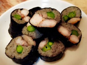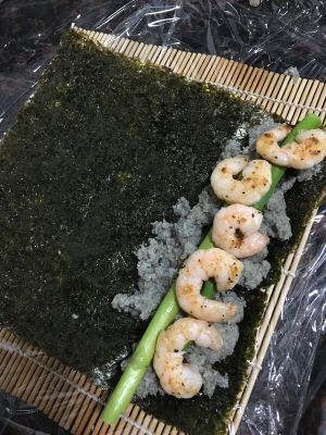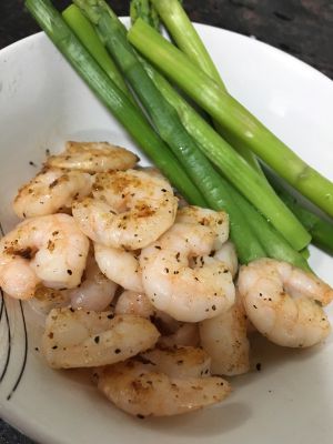 芦笋烫熟。虾仁用少许油、盐、胡椒煎熟。盛出,待用。