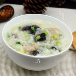 准备食材,瘦肉切薄皮,放油、盐、酱油、淀粉拌均,皮蛋切块,香葱切碎;