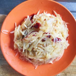锅热后把这些放进去爆炒一下 然后放入土豆丝 如果土豆丝有点干可以放点料酒。然后放点白醋。加盐,十三香,鸡精。