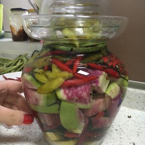 把烧开凉凉的水放到罐里把要泡的菜放进去。