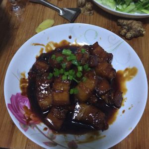 煸好后的五花肉盛出,冰糖和少量水熬煮至棕色,中火慢熬,然后倒入五花肉、八角、桂皮、葱段,大火迅速翻炒,使每块肉都裹上糖色后倒入之前去浮沫剩下的肉汤,水面和肉面持平,盖上锅盖,大火烧开后转小火慢炖,40分钟后放盐,最后大火收汁。