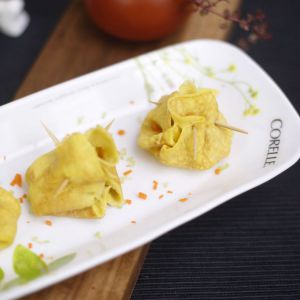 将蛋皮切成5平方厘米大小的正方形,放入馅料后包起来,以牙签固定。