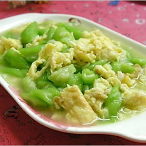 锅中底油,油微热放姜末爆香,倒入焯过水的丝瓜,加盐翻炒