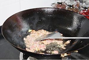 起锅做油,油热后放入大料葱花和姜末煸炒出香味后放入肉馅。
