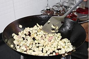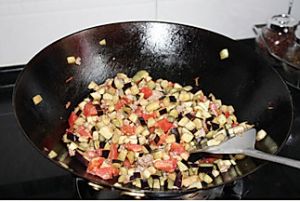 茄子稍微变软后放入西红柿丁继续翻炒,把西红柿炒得基本没型后加入酱油和料酒。