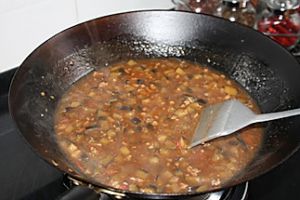 加入水煮开后大火炖十分钟,茄子炖懒后倒入水淀粉勾芡。出锅钱倒入适量的盐,关火后淋一点香油即可。