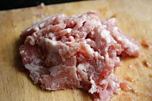 准备好肉馅,我家肉馅分装成一小块一小块的放在冰箱里冻着,吃的时候拿出来一块。