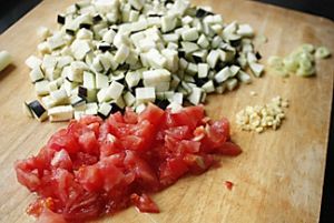 茄子不去皮切成小丁,西红柿也切成丁。并准备好葱花和姜末。