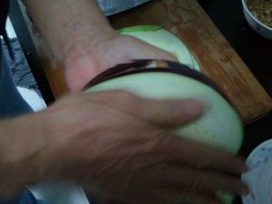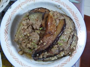 茄子里填肉馅大概3/4就可以,然后把茄子合什,双手积压,肉馅就分布均匀了。