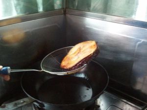 冷锅热油,油温烧至有点熏手,大概就是4成热的时候,放入茄盒,炸制两面金黄色就可以捞出了。