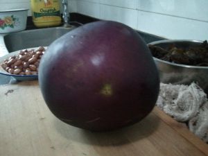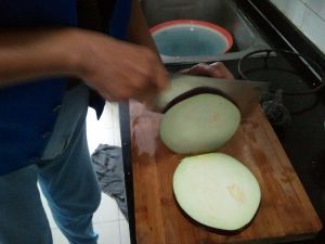 茄子对半切开,再切成约2厘米的厚片,切两片但是中间不能切断,这样一个茄子可以切成五个大片。