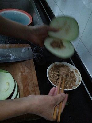 馅料搅拌均匀后,腌制10分钟左右,就可以把肉馅夹入切好的茄子里了。