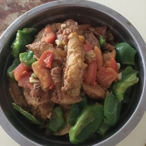 西红椒切成小块、柿子椒手撕成小块,蒜拍碎,锅内放油随后马上放入一颗八角、花椒、蒜沬爆香,放杮子蒜炒2-3分钟左右放西红柿翻炒,放入炸好的茄子,翻炒均匀,放一点生抽、盐和一点开水,焖煮5分钟左右,放鸡精炒匀即可,味道鲜美可口,孩子下饭