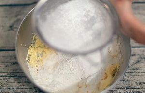 将低粉和玉米淀粉混合过筛,加入到黄油糊中。烤箱175度预热。