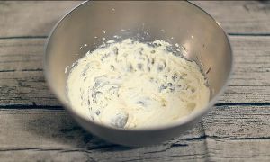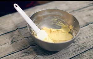 糖粉和细盐加入到软化的黄油中一起打发,至颜色变浅体积膨胀,呈羽毛状。
