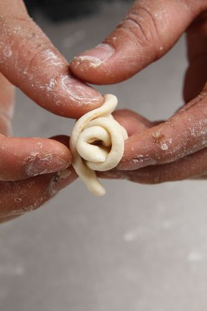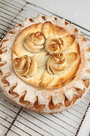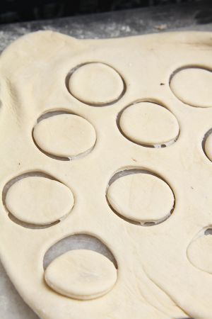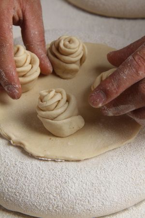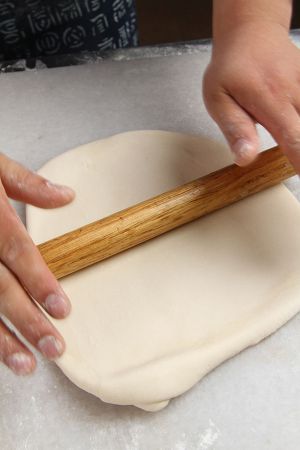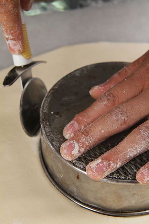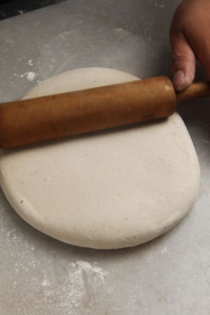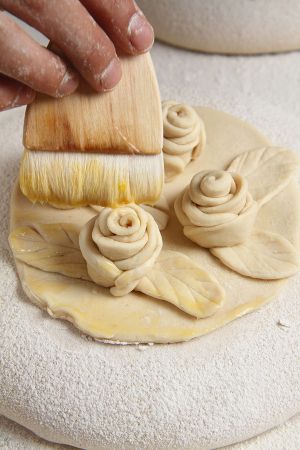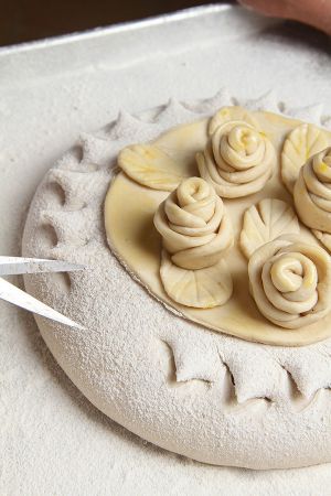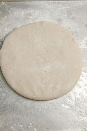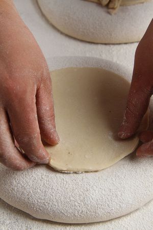 将8寸圆形面团放入发酵好的面团表面,先洒上黑麦粉。