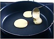 将平底锅放在火上,开小火,舀一勺面糊,倒入锅中,煎至底部凝结后翻面。