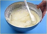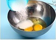 将A料的蜂蜜、白砂糖和鸡蛋混合,用打蛋器隔热水将鸡蛋打发,鸡蛋打至浓稠呈淡淡的乳黄色即可。