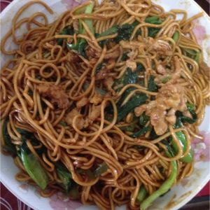 4、锅里加油炒青菜,然后放面条,加盐、蚝油、生抽、老抽、少许白糖。